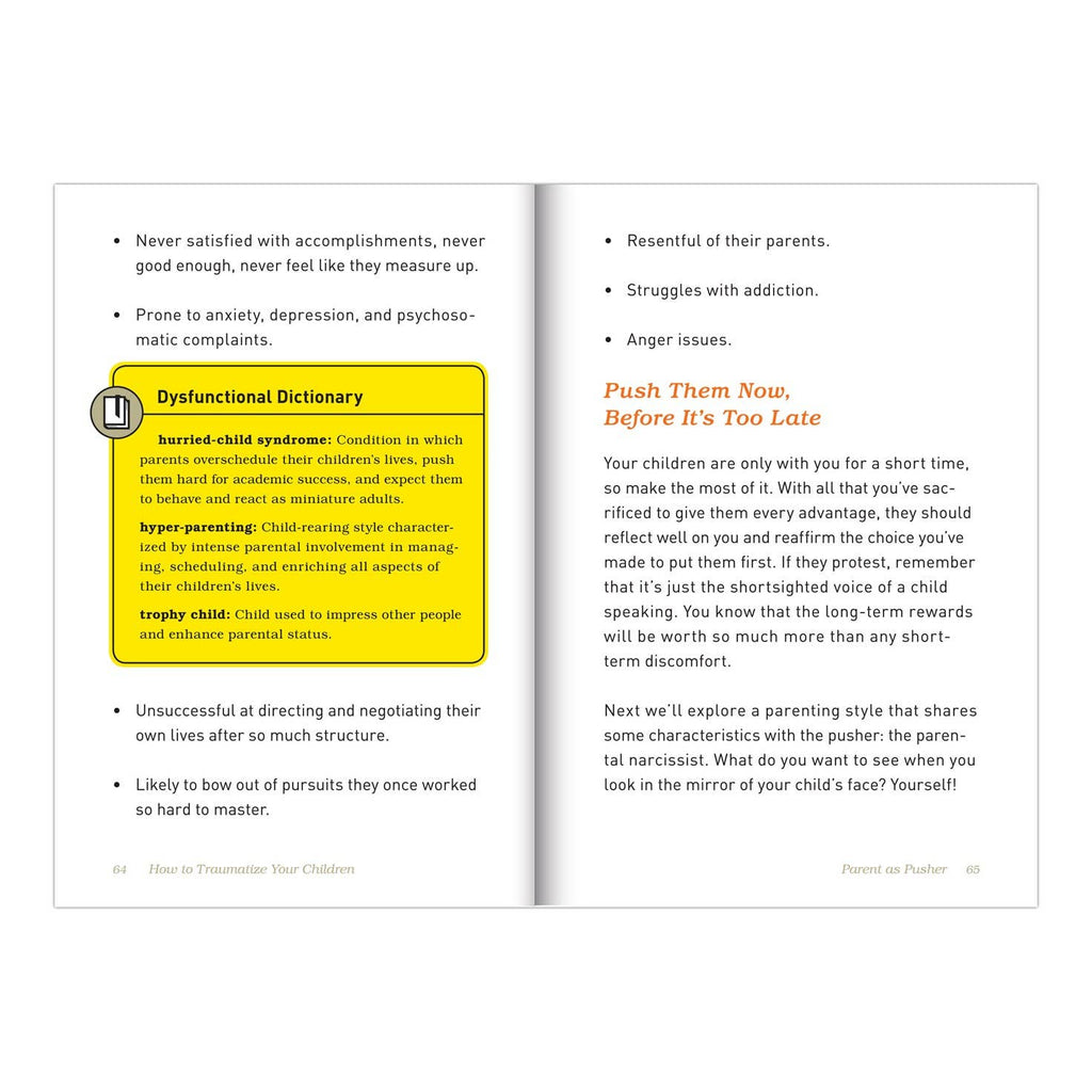 Parents of the world rejoice! Our bestselling How to Traumatize Your Children: 7 Proven Methods to Help You Screw Up Your Kids Deliberately and with Skill has been revamped with all-new totally dysfunctional illustrations. This groundbreaking instructional volume teaches you how to give your children the lifelong gifts of mental and emotional damage. Whether you employ the same ruinous techniques your parents used or try out an entirely new approach, you’re bound to succeed! Learn the latest buzzwords and trends in traumatic parenting! Choose a personal trauma style—controlling, indulgent, and more! Paperback; 4.5 x 6.5 inches; 144 pages Written by Knock Knock